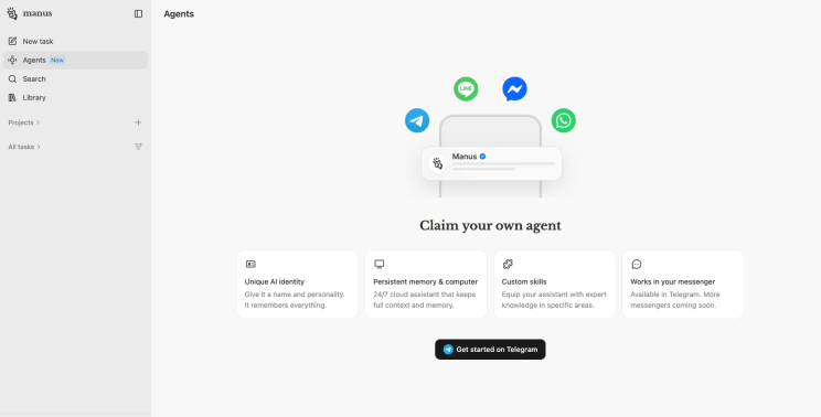 Manus —adquirida por Meta— lanzó sus agentes completos dentro de Telegram. Escaneas un QR y en menos de un minuto ya están investigando o conectando tu Gmail y Notion, cero APIs.